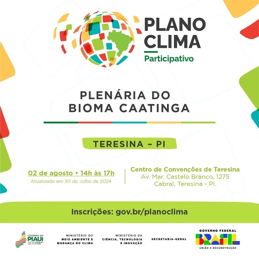 Plenária do Plano Clima Participativo – bioma CaatingaData: sexta-feira, 2 de agosto Horário: 14hLocal: Centro de Convenções de Teresina, na avenida Mar Castelo Branco, 1275, Cabral, Teresina/PI