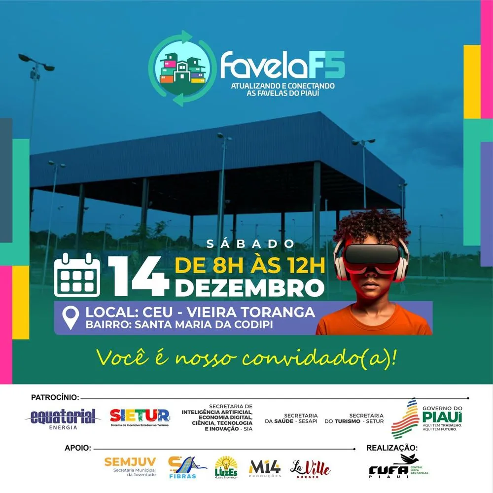 O Favela F5 é uma iniciativa da Central Única das Favelas do Piauí (Cufa-PI) que busca integrar comunidades da região da Grande Santa Maria da Codipi e do Grande Dirceu, em dois dias repletos de atividades culturais, educativas e de cidadania. O evento contará com emissão de documentos, atendimento médico, práticas integrativas como aromaterapia, apresentações artísticas, além da exposição de serviços digitais e tecnológicos.