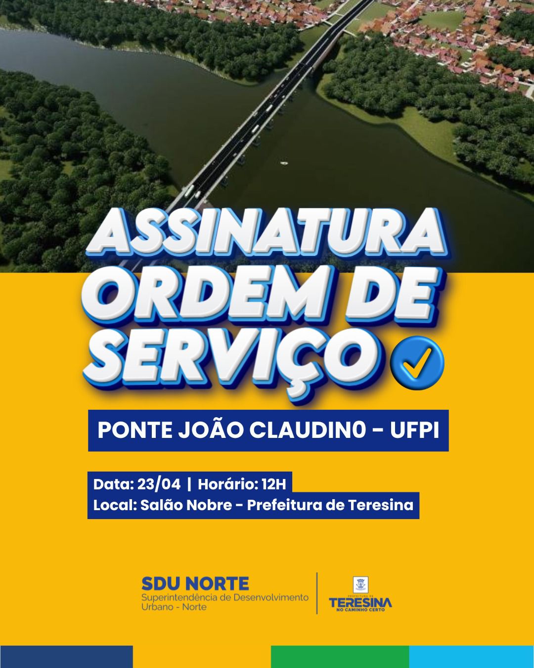 A Prefeitura de Teresina dá um passo importante para a melhoria da mobilidade urbana da capital com a assinatura da ordem de serviço da Ponte João Claudino, conhecida popularmente como ponte da UFPI. A solenidade será realizada nesta quinta-feira (22), no Salão Nobre da PMT, marcando o início oficial de uma obra aguardada há anos pela população.